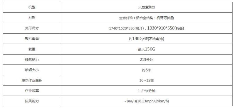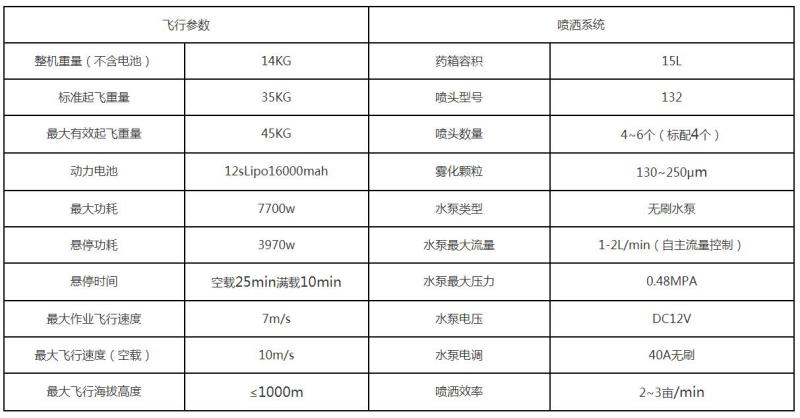 大載重是植保無人機發(fā)展的一個趨勢,十五公斤現(xiàn)階段已較為成熟。配置如下F: