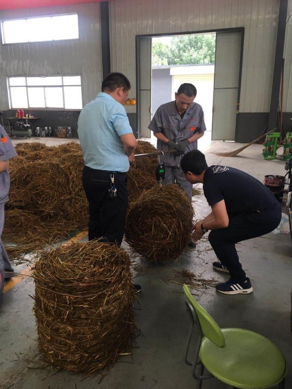 鑒定檢驗(yàn)人員要求對(duì)機(jī)器進(jìn)行連續(xù)工作18小時(shí)測(cè)試,必須保證工作期間零故障率,這是對(duì)機(jī)器本身的質(zhì)量和操作人員的檢驗(yàn),并進(jìn)行了現(xiàn)場(chǎng)草捆稱重,檢驗(yàn)草捆含水量,每包草捆的重量是否均勻,尺寸是否一致。
